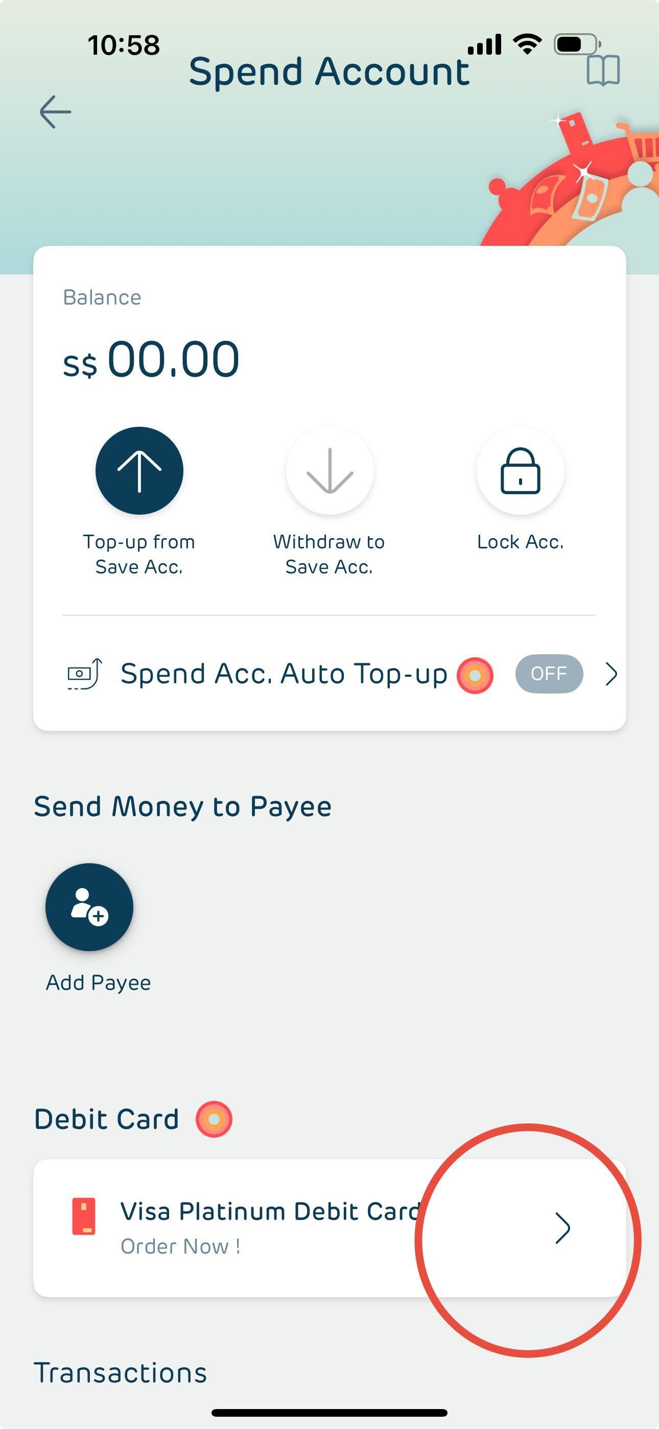 You can order a Hugosave Debit Card by clicking the "Order now" on the Hugosave Platinum Visa Spend Account Banner on your Home screen. (see image below)