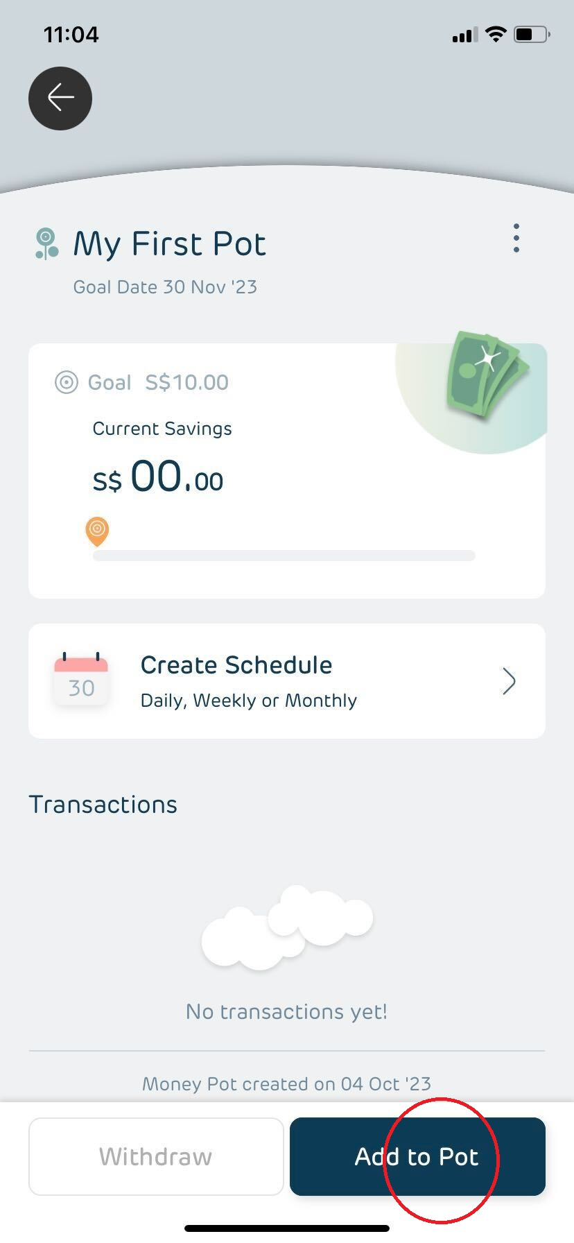 - Click the Add Money button within the Hugosave Money Pots tab.