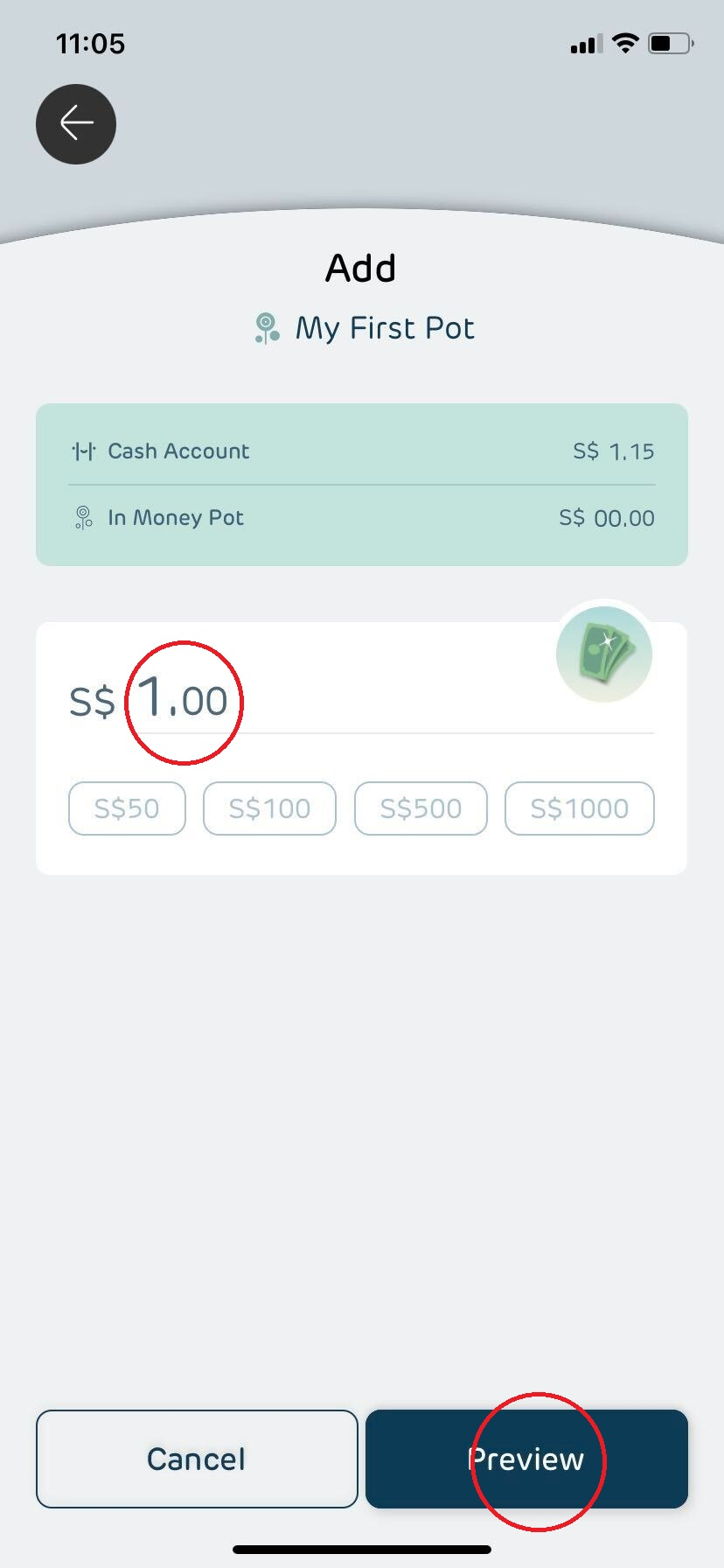 - Add the desired amount of money to your preferred Hugosave Money Pot and click "Preview"