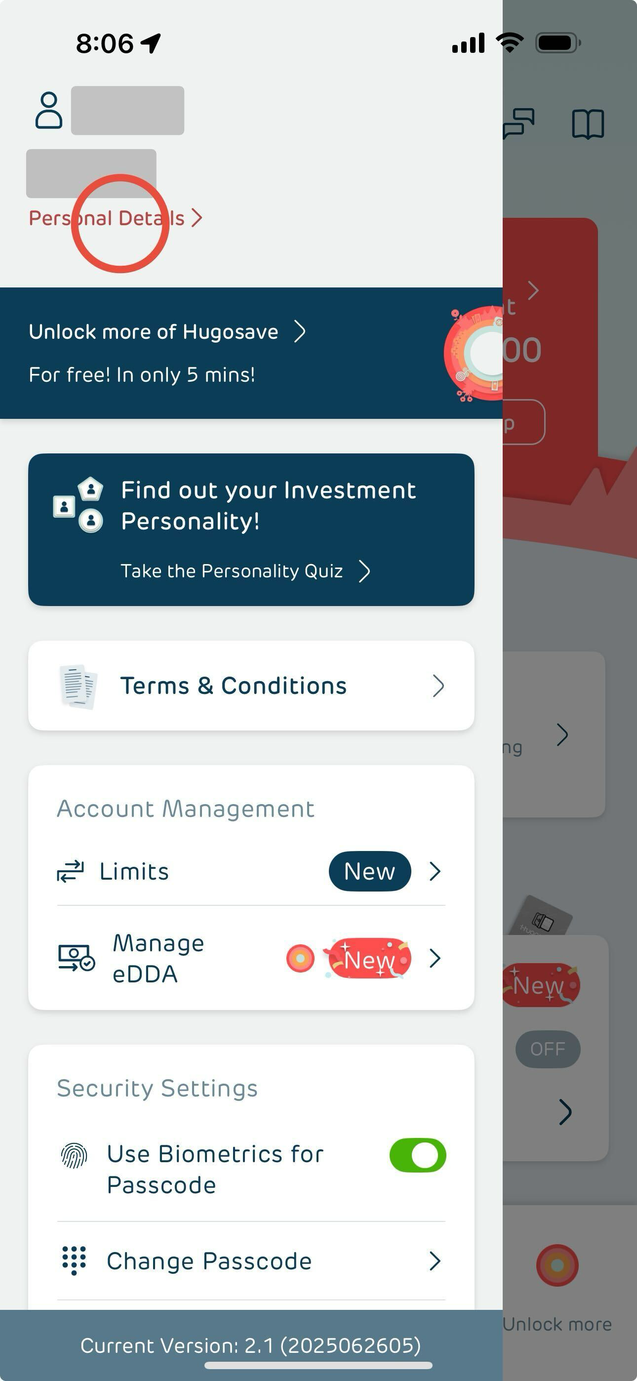You are able to view your Personal Details within the Hugosave app via the Menu button located on the top left-hand corner of the Home screen.
