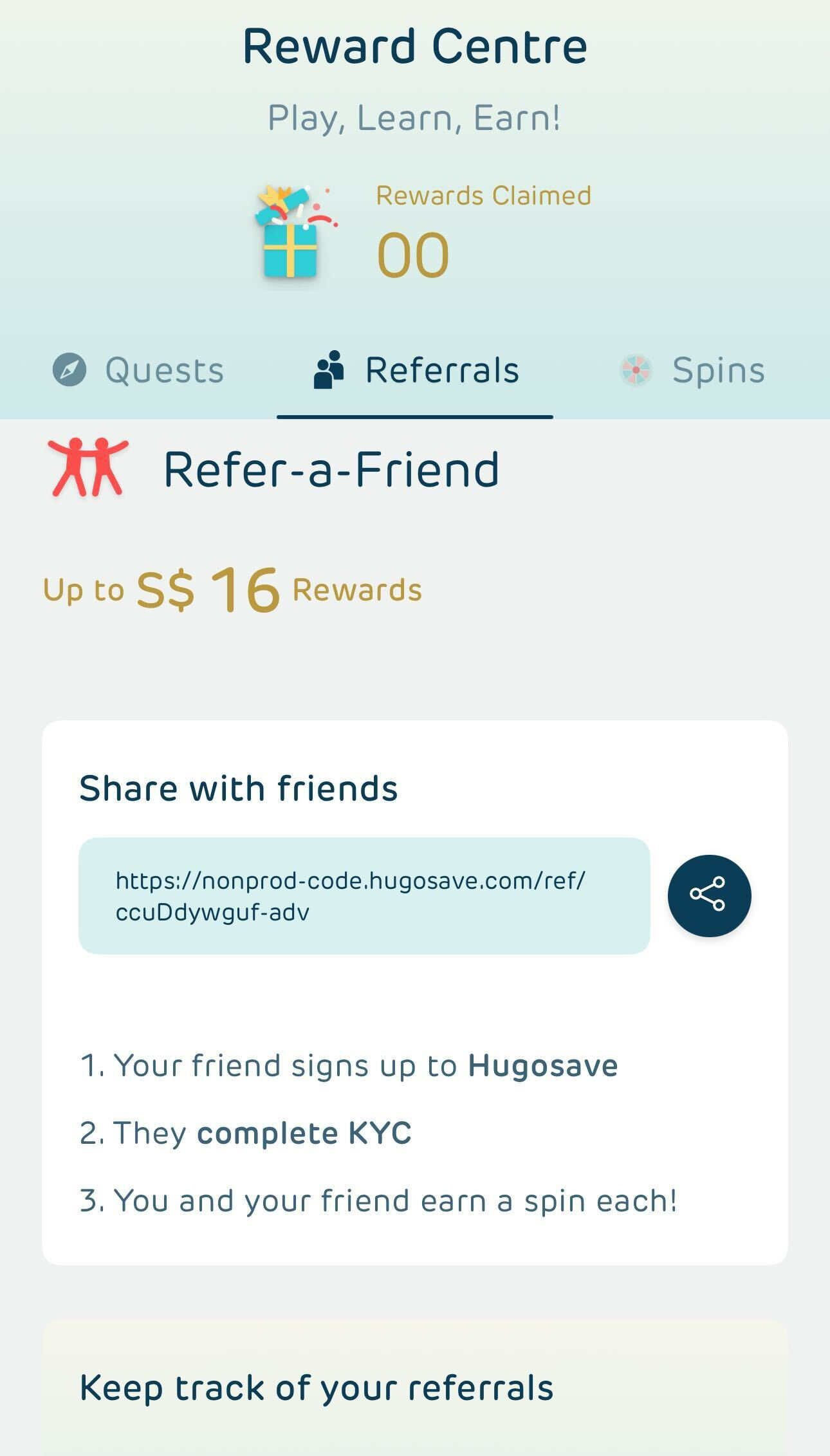 Please do know that you are able to track your referral via the Hugosave app under the Reward Centre -> Refer Tab. (See image below)